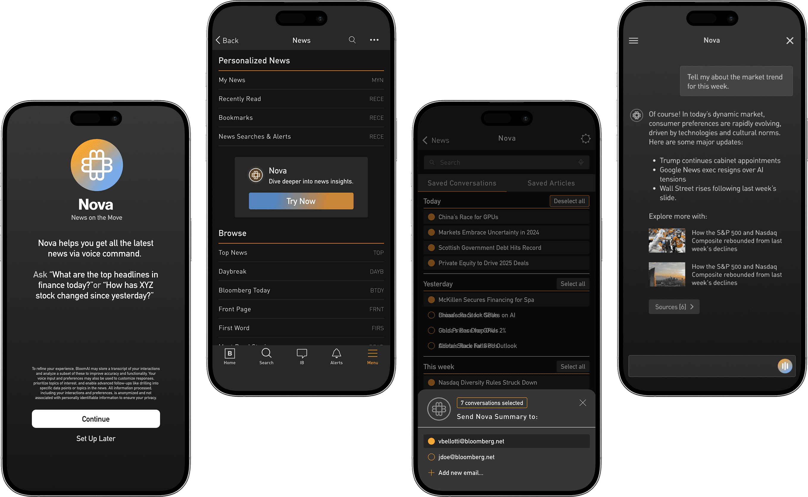Introducing Nova — a GenAI-powered text-to-speech feature we designed tailored for the Bloomberg News experience. The project improved productivity and efficiency for busy professionals, using GenAI to deliver seamless, actionable news through voice commands and dynamic topic exploration.